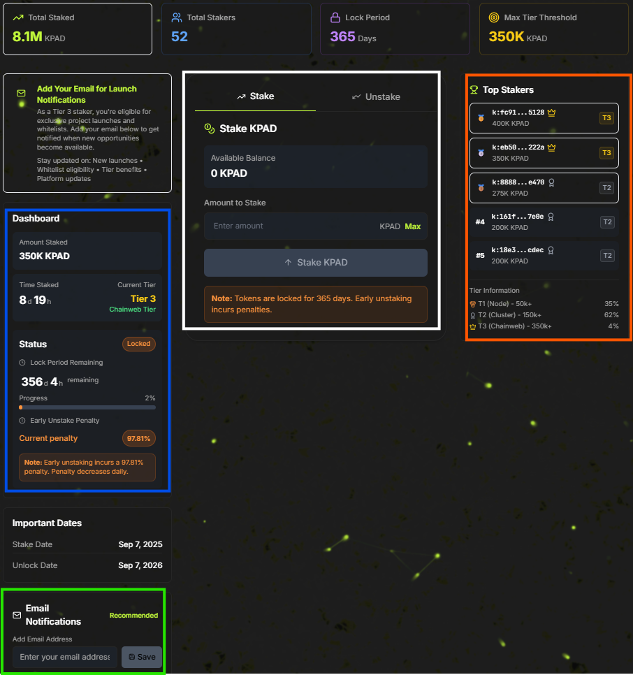 - Mandatory Lock-up: All staked $KPAD tokens will be locked for a mandatory period of 1 year. During this time, tokens cannot be withdrawn. This ensures long-term commitment to the ecosystem.